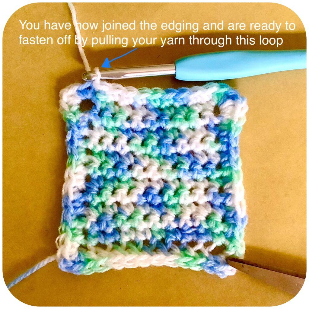 Fasten off your work by pulling your yarn through the loop on your hook.